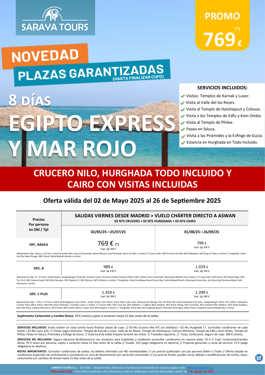 Egipto Express y Mar Rojo 8D *Crucero Nilo, Hurghada TI y Cairo + Visitas incluidas. Hasta Abril 26. Dsd 779 €